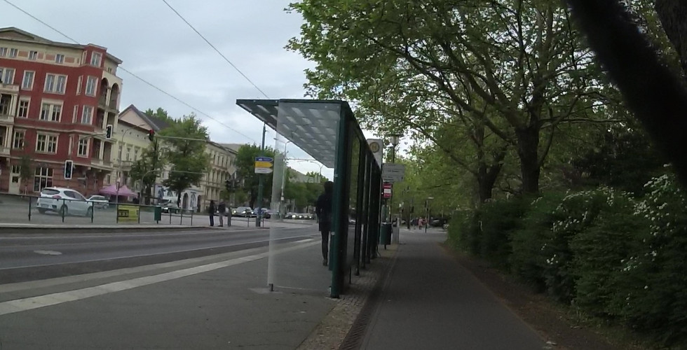 Hier gibt es einen getrennten Geh- und Radweg. An der Haltestelle wird jedoch nicht gekennzeichnet, dass der Gehweg und der Radweg die Position wechseln.